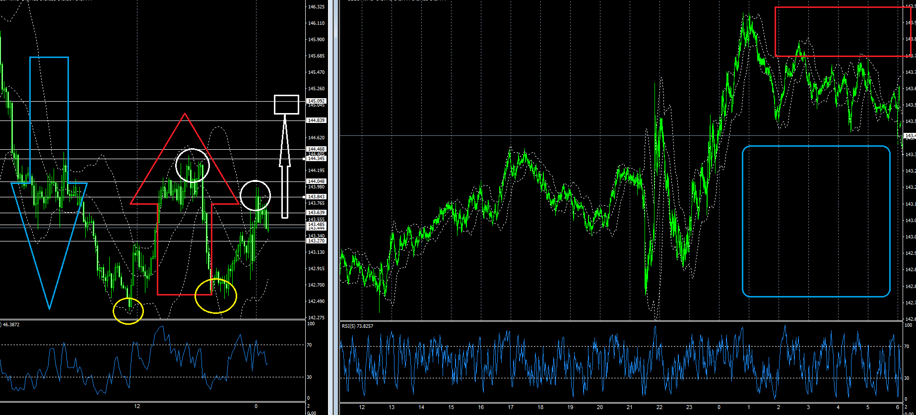 1分足チャートで目先を予測すると、青□の中に落ちてくるか、赤□の中を目指して上昇かと言う所でしょう。