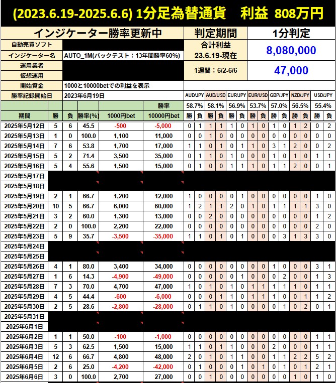 【週報:2025.6.2-2025.6.6】バイナリー1分足判定用 オリジナルツール「AUTO_1M」結果