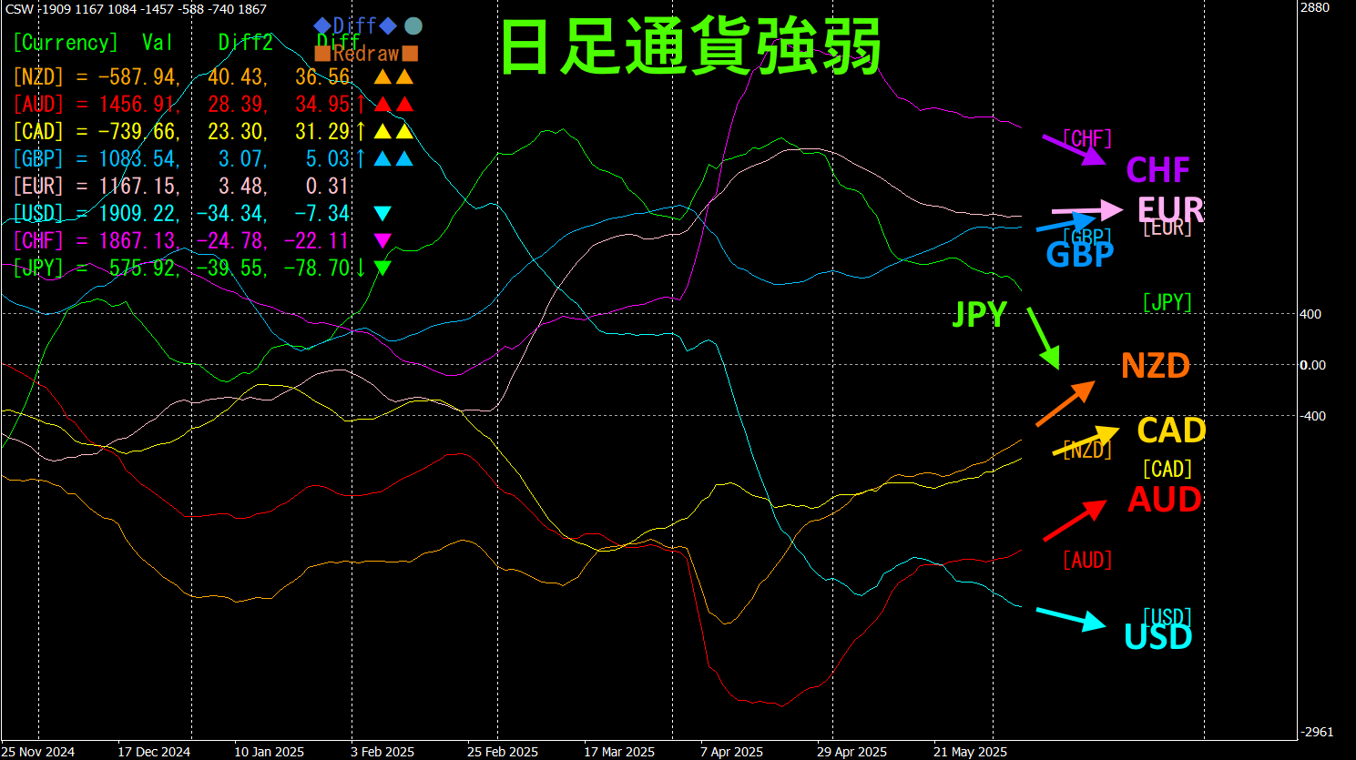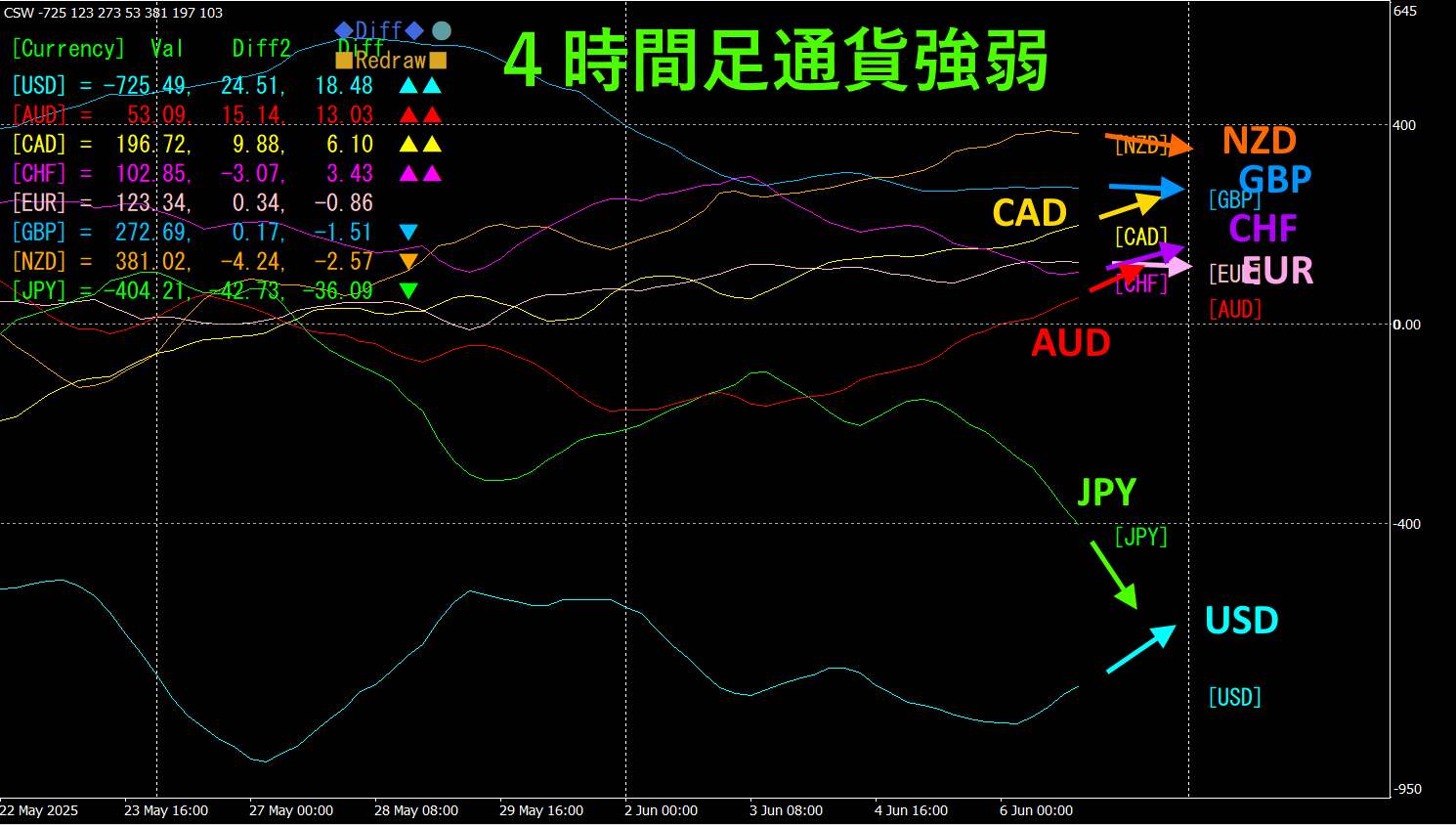 4時間足では、USD、AUD、CAD、CHFが上向きに、JPY、NZD、GBP、EURが下向きになっています。4時間足でもJPYが大きく下を向いています。