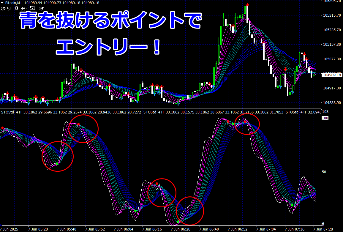 インジケーターの帯はピンク・緑・青の3層構造で、3層の帯は、収斂と拡散を繰り返しますので、 上昇時は、上から ピンク・緑・青 の並びとなり、下落時は、その逆で、上から青・緑・ピンクの並びになります。