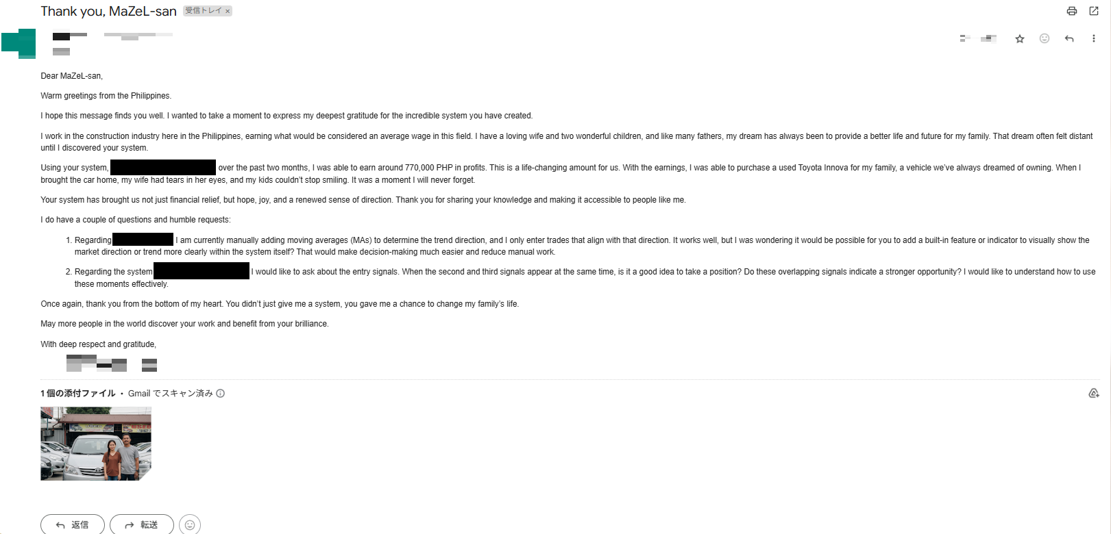 この2か月間、あなたの「○○○○○○○○」を使って、私は約77万ペソ(PHP)の利益を得ることができました。私たち家族にとって、これは人生を変えるような金額です。この収益で、家族のために中古のトヨタ・イノーバを購入することができました。ずっと憧れていた車です。車を家に持ち帰ったとき、妻は涙を流し、子どもたちは笑顔が止まりませんでした。この瞬間は、一生忘れられない思い出です。