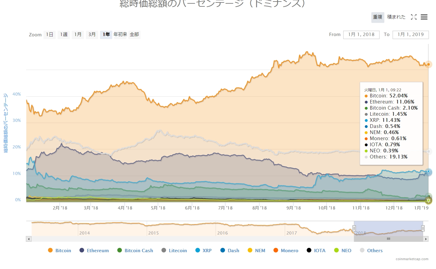 画像は2019年1月1日のキャプチャ。新年最初の相場環境は、全面「赤」となりました。昨年が仮想通貨にとって厳しい一年でしたが、その流れは今年にも引き継がれそうです。主要どころで2~6%の下落を見せています。