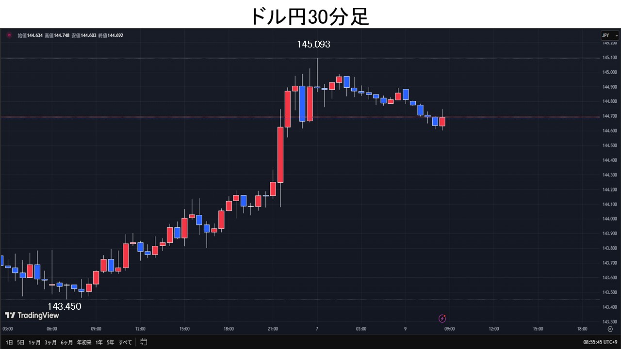 米中貿易摩擦懸念緩和や強い米国雇用統計受け、ドル円は一時145円台。