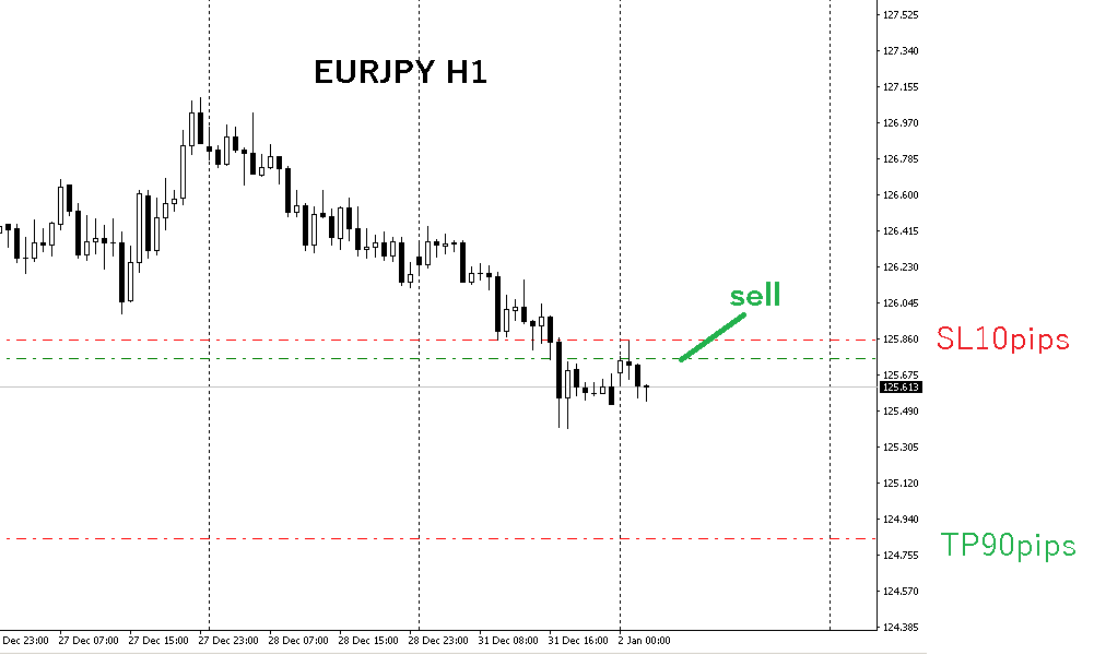 新年一発目は、ユーロ円売りエントリー。ストップロス(損切りに逆指値注文)が10pipsで、利食い目標が90pips。