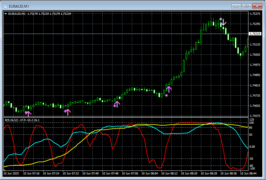 上の1分足では、R1R2S2のサインの押し目買いサインと戻り売りサインがタイミングよく点灯している。