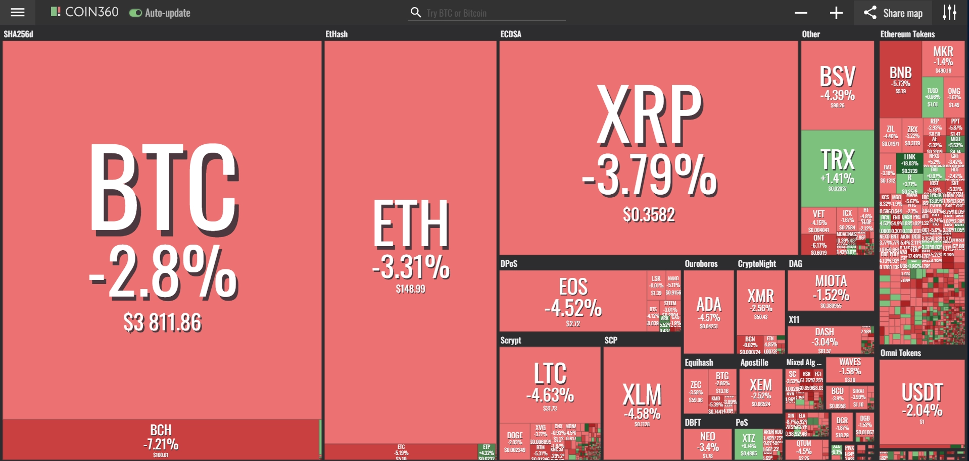 coinmarketcap(コインマーケットキャップ)のサイトから、ドミナンス(各銘柄が仮想通貨全体の時価総額に占めるパーセンテージ)を定点観測していきます。仮想通貨全般が下方向に大きく動き出している相場状況を受け、毎日更新することとし、仮想通貨業界を俯瞰および転換期を早期に発見することを目的とします。