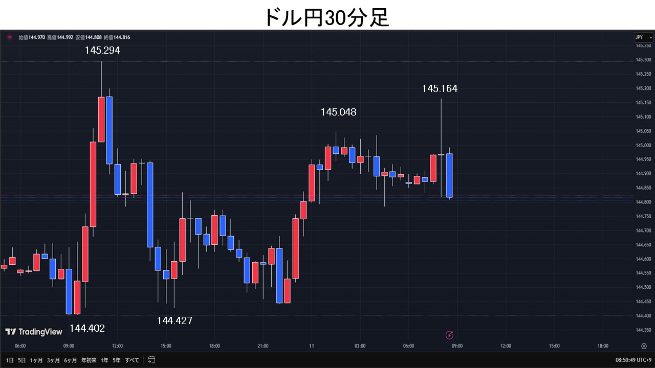 東京時間、ドル円は、日経平均の堅調や植田日銀総裁が「基調的な物価上昇率はまだ2%に少し距離がある」と発言した事などを受け、一時145.29円まで上昇。しかし、買いは続かず144.42円まで失速。欧州時間、ユーロドルやポンドドルでドル買いが先行すると、ドル円は144.80円まで上昇。NY時間、米中貿易協議の進展を控える中、警戒感よりは期待感の方がやや優勢となっており、リスク・オンの「円売り・ドル買い」が先行。ドル円は145.04円まで上昇。