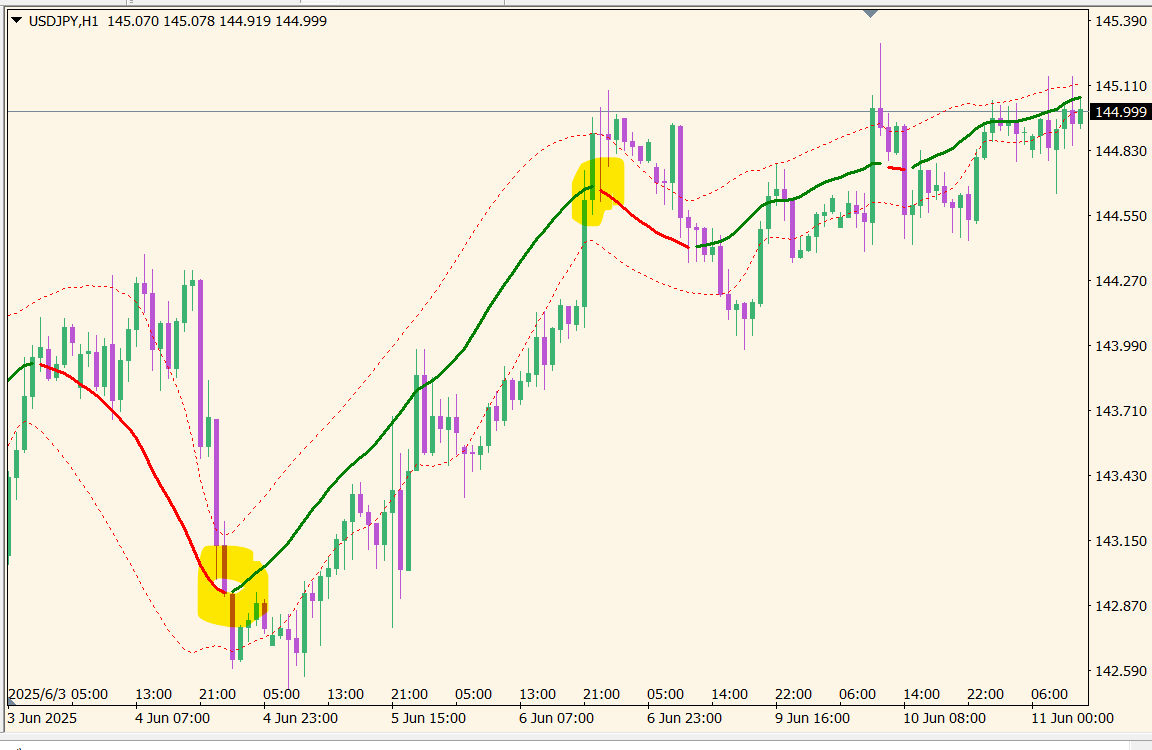 先週、4日から6日にかけてドル円は円安方向へ。スプレッドもあるので大きな動きを1時間足でねらう裁量トレード。といってもやることは単純で、インジケーターで上昇トレンドが出たときに買い、トレンドが終わったら売るだけ。