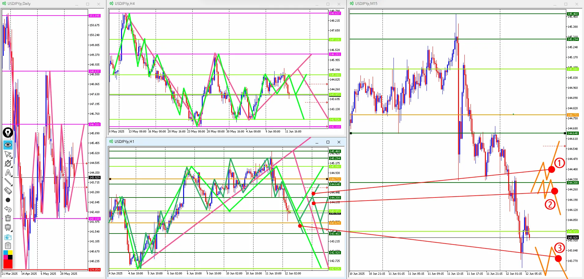 ●日足・4時間足・1時間足・15分足までの相場を水平線と波動(ダウ理論)を使って環境認識し、勝率の高いエントリーポイントを3つに絞る