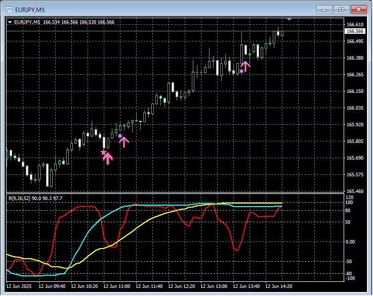 mBDSR(RCI2本フィルター)のサインとR1R2S2のサインの両方を活用する(21) ユーロ円 5分足
