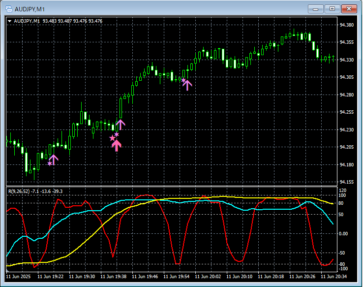 mBDSR(RCI2本フィルター)のサインとR1R2S2のサインの両方を活用する(22) 豪ドル円 1分足