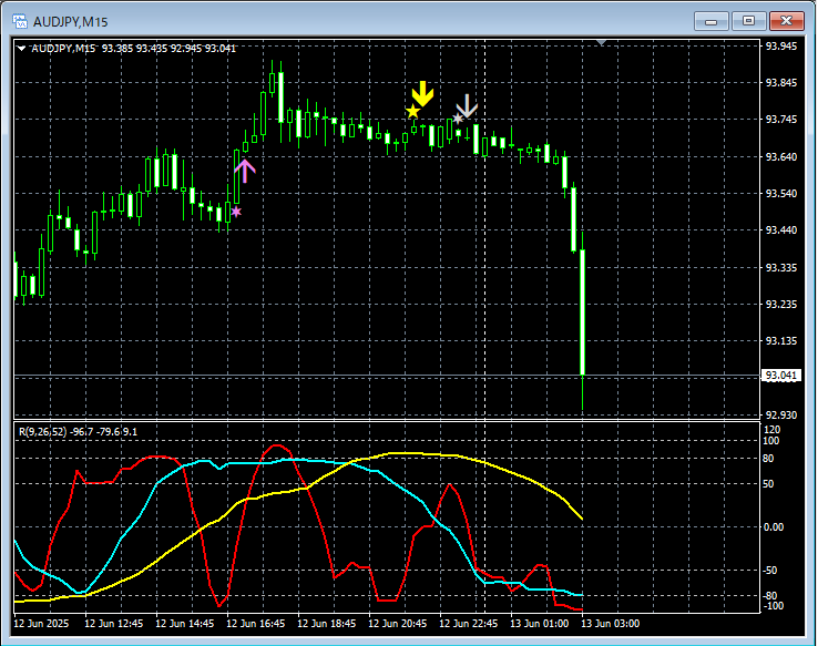 mBDSR(RCI2本フィルター)のサインとR1R2S2のサインの両方を活用する(25) 豪ドル円 15分足