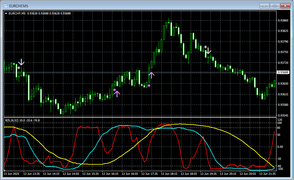 【昨日の ユーロスイス 5分足チャート】RCIの2段階判定を利用したR1R2S2のサイン