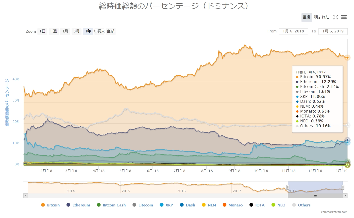 画像は2019年1月6日のキャプチャ。昨日は全面的に「緑」の相場環境で、イーサリアムが8%増と好調、主要どころも2~4%超の上昇となっていました。今日はビットコインとビットコインキャッシュ、イーサリアムが「赤」となり、一方でライトコインが6%ほどの上昇を見せています。