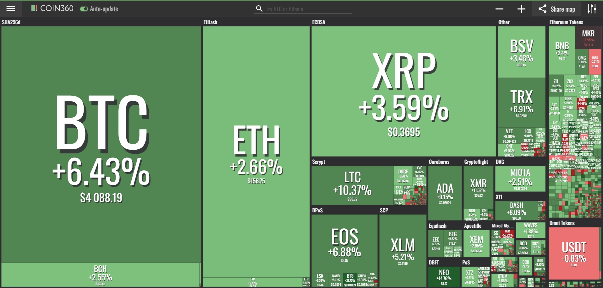 coinmarketcap(コインマーケットキャップ)のサイトから、ドミナンス(各銘柄が仮想通貨全体の時価総額に占めるパーセンテージ)を定点観測していきます。仮想通貨全般が下方向に大きく動き出している相場状況を受け、毎日更新することとし、仮想通貨業界を俯瞰および転換期を早期に発見することを目的とします。