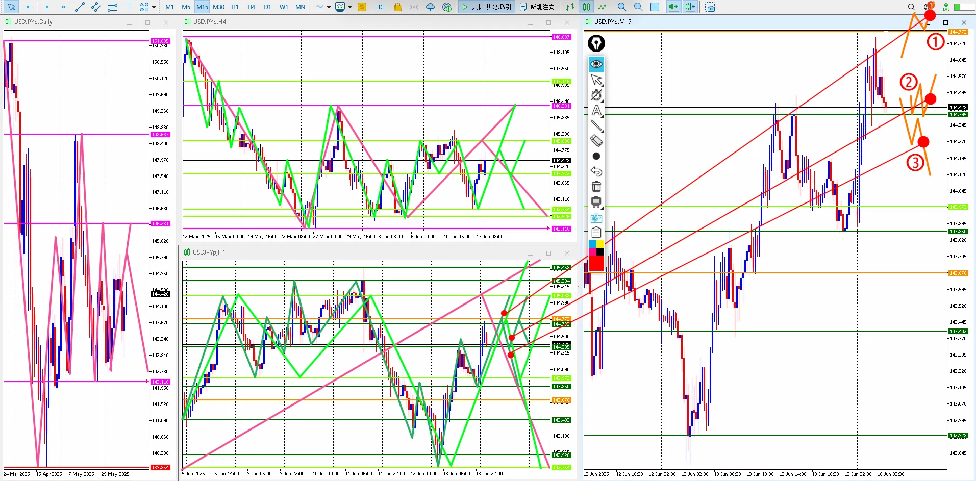 ●日足・4時間足・1時間足・15分足までの相場を水平線と波動(ダウ理論)を使って環境認識し、勝率の高いエントリーポイントを3つに絞る