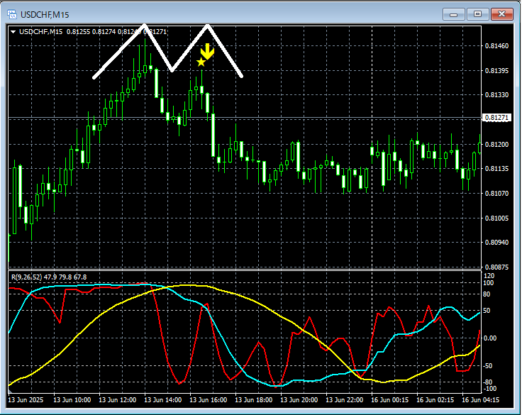 上の15分足では、結果としてダブルトップの右側の山における下げ開始のタイミングをmBDSR(RCI2本フィルター)の戻り売りサインが上手くとらえていることが分かる。とてもよくあるパターンである。