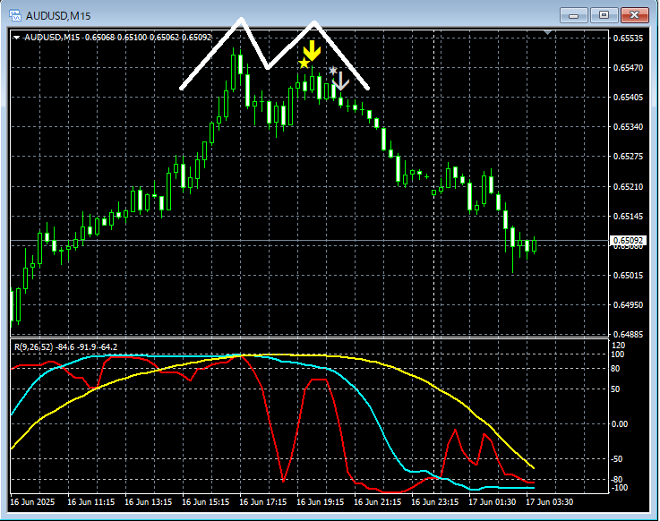 mBDSR(RCI2本フィルター)のサインとR1R2S2のサインの両方を活用する(29) AUDUSD 15分足 (ダブルトップにも注目)