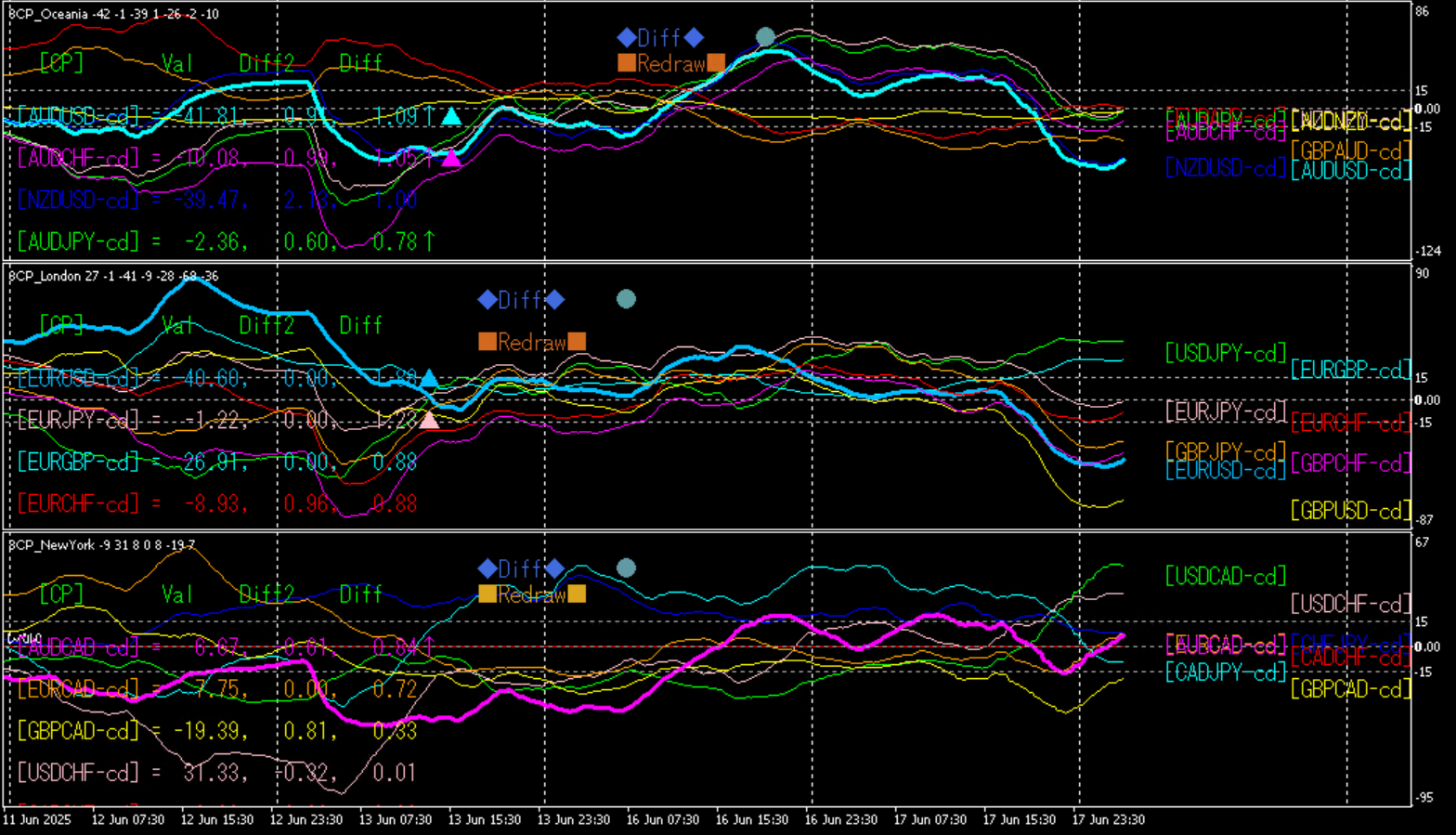 3つの「見える化インジケータ」を同時に1画面で表示させたため、少し見にくいですが、それぞれの市場チャートで、最も角度が急な通貨ペアを太線で表示してあります。