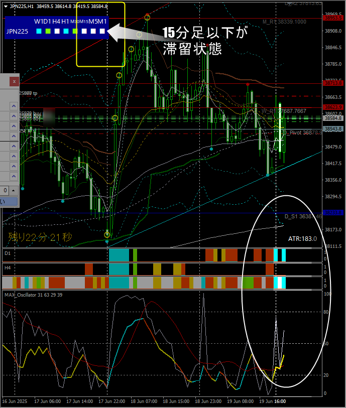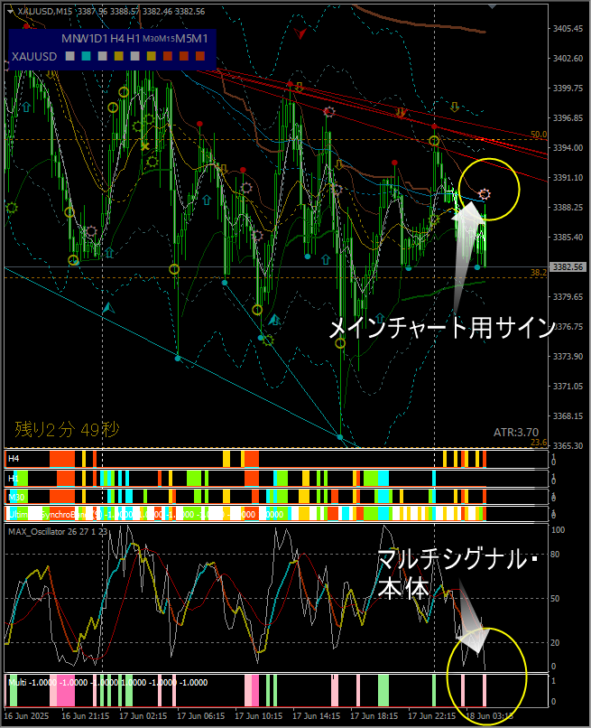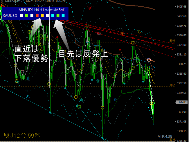 30分足は下示唆、15分足は上示唆と、隣り合う時間足の色指示が逆