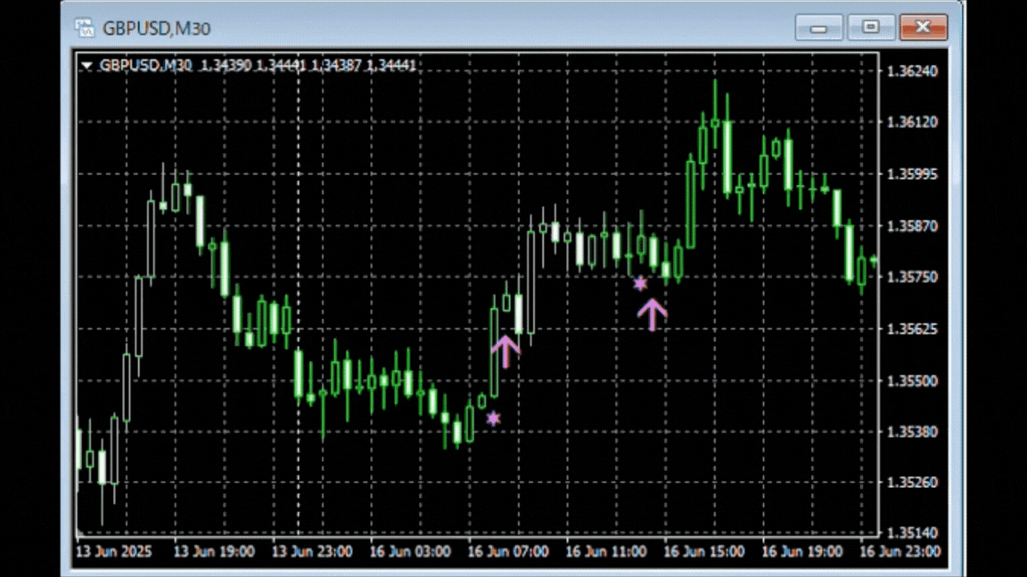 (2025年6月17日 ポンドドル 30分足 戻り売り +75pips)