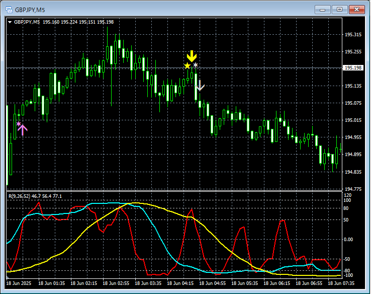 mBDSR(RCI2本フィルター)のサインとR1R2S2のサインの両方を活用する(31) ポンド円 5分足