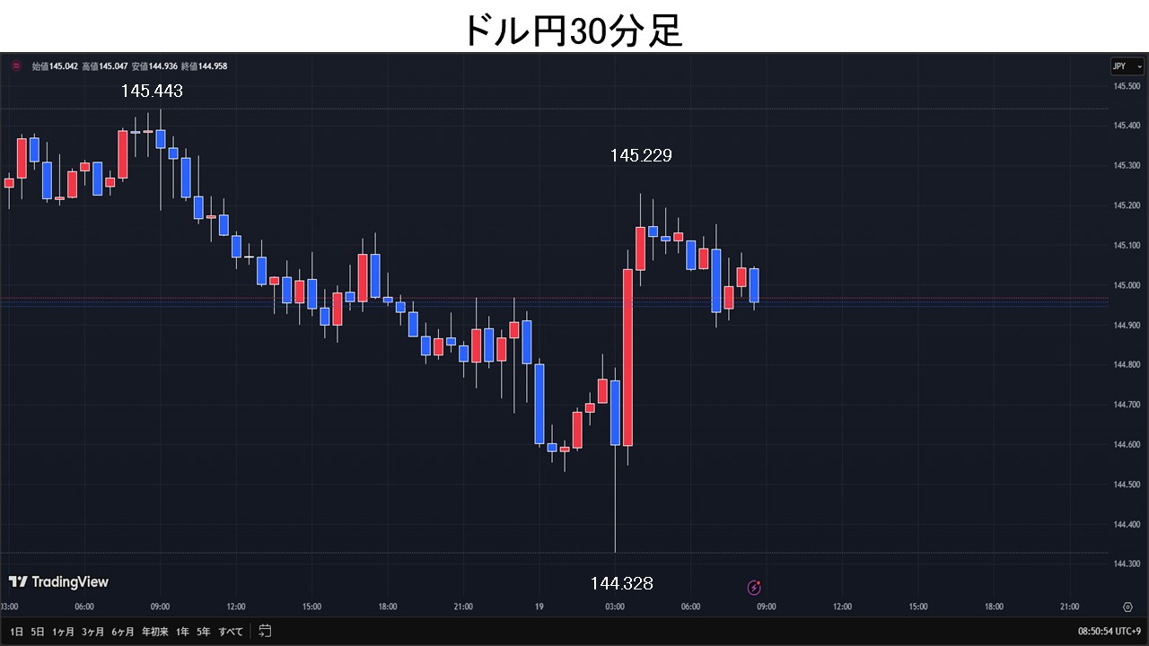 東京時間、ドル円は、朝方145.44円を付けた後、FOMCやパウエルFRB議長発言を控え、ポジション調整の売りでジリ安。昼過ぎに「イスラエル軍がイランの核施設を攻撃した」などの報道も伝わったが、「有事のドル買い」にはつながらなかった。欧州時間、トランプ米大統領が「イランからの接触があった」「イランは交渉を望んでいる」などと発言すると、中東情勢における過度な警戒が後退。有事のドル買いに対する巻き返しで、ドル円は144.53円まで下落。NY時間、FOMCは、市場予想通り政策金利を4.25-4.50%で据え置くことを決定。声明では「経済の見通しを巡る不確実性は低下したものの、依然として高い」との見解が示され、「失業率とインフレ率の上昇リスクが高まった」との文言を削除した。ドル円は発表直後144.32円まで下落。その後、パウエルFRB議長が記者会見で「労働市場の状況は引き続き堅調」「調整を行う前に、より詳細な情報が得られるまで待つのが適切」「労働市場は利下げを強く求めていない」などと述べ、早期利下げに慎重な見方を示したことから、ドル買いが先行し、ドル円は145.22円まで上昇。