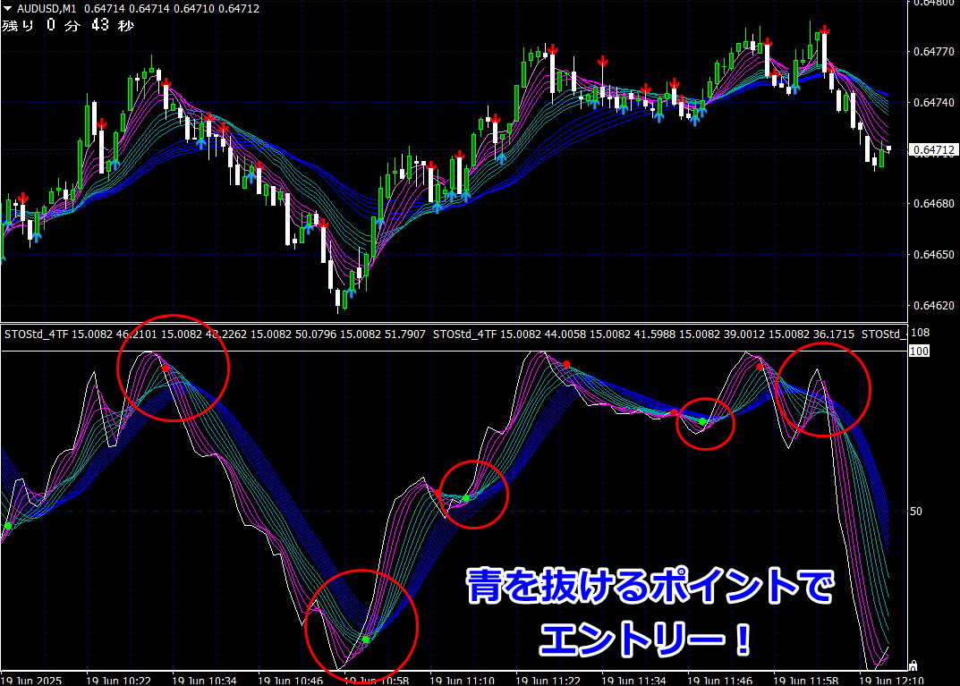 インジケーターの帯はピンク・緑・青の3層構造で、3層の帯は、収斂と拡散を繰り返しますので、 上昇時は、上から ピンク・緑・青 の並びとなり、下落時は、その逆で、上から青・緑・ピンクの並びになります。
