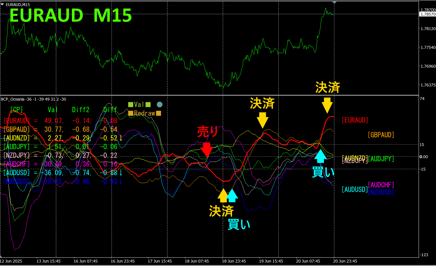 上半分は、EURAUDの15分足チャートです。下半分は、「8CP見える化インジケータ」によるものです、赤色太線のグラフがEURAUDに相当します。