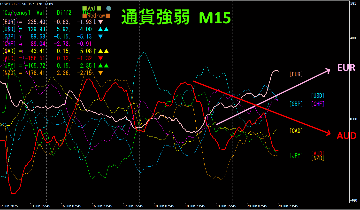 15分足の通貨強弱グラフを見ると、EURとAUDの波としての動きが見えてくるので、EURAUDの通貨ペアなら、上げ基調であることを読み取ることができます。波動なので、変動がありますが、EURは上げの波、AUDは下げの波になっています。NZDもAUDと同様の挙動ですので、EURNZDを買っても良かったということも見えてきます。