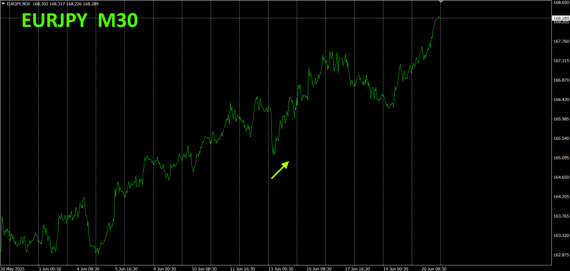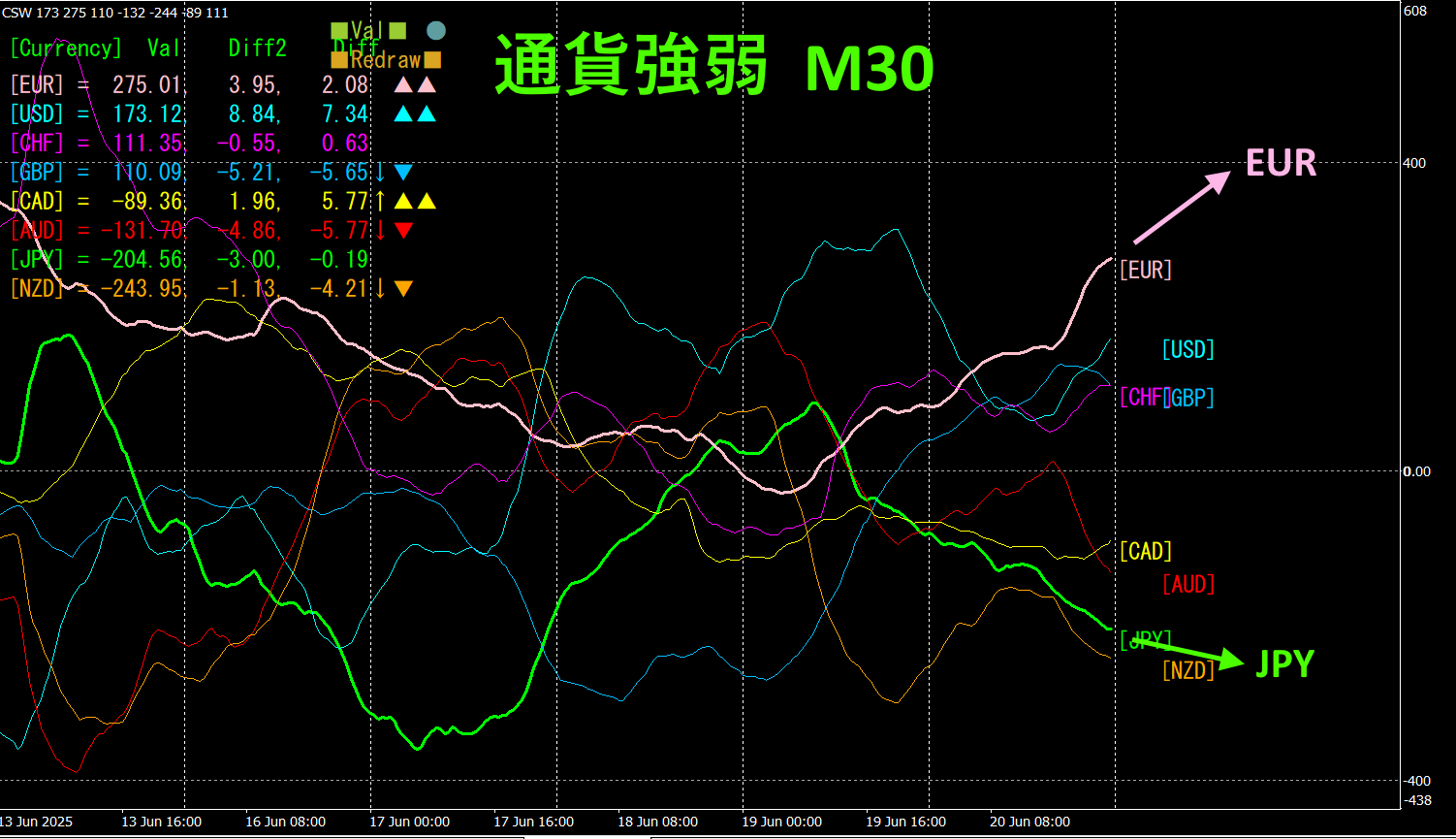 ピンク色がEUR、緑色がJPYです。通貨強弱チャートでは、EURが上向き、JPYは下向きになっているので、EURJPYは、今後も、上昇傾向が続くと考えられます。