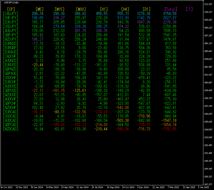 Total]数値の降順に並んでいます。一番上にあるCADJPYは、全ての時間足で青色の表示色になっています。Total数値が+3154.59と、大きいプラスの数字になっています。全ての時間足で、CADJPYに上昇トレンドが発生していることが明らかです。