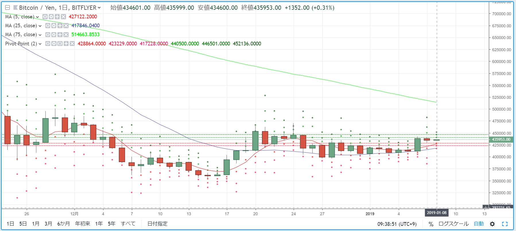 画像は2019年1月9日のキャプチャ。昨日は調整的な全面「赤」となっていましたが、今日は多くの銘柄が「緑」で小反発しています。とはいえその反発は小さく、1%ほどとなっており、少しの変動で「赤」に転じる可能性もはらんでいます。方向感のないもみ合いを演じていえるといえます。