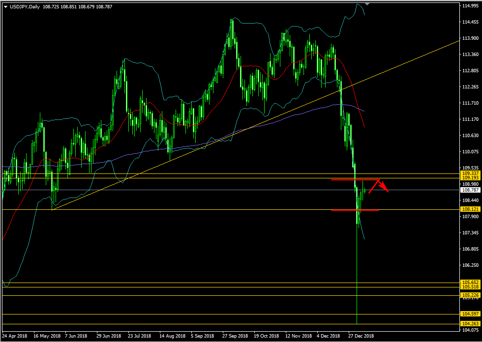 ドル円の日足チャートから見てみます。ドル円日足では、先日より引き続きドル円109.193円のレジスタンスラインと108.121円のサポートラインに挟まれた中を推移しており、以前レンジ状態は継続しています。このドル円109.193円のレジスタンスラインと108.121円のサポートラインはかなり強めの壁と思われますので、上か下に抜けない限りはこの挟まれたライン内でレンジ状態が続くと思われます。