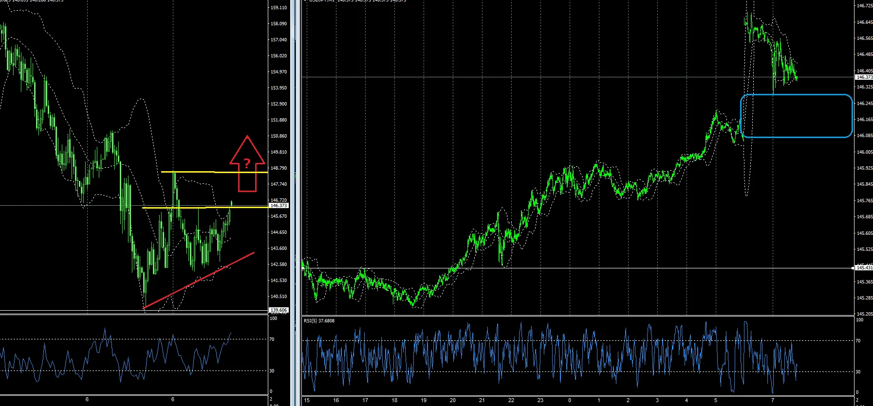 先ずはここを目指すのか底堅いのかを1分足で探って行く事になります。