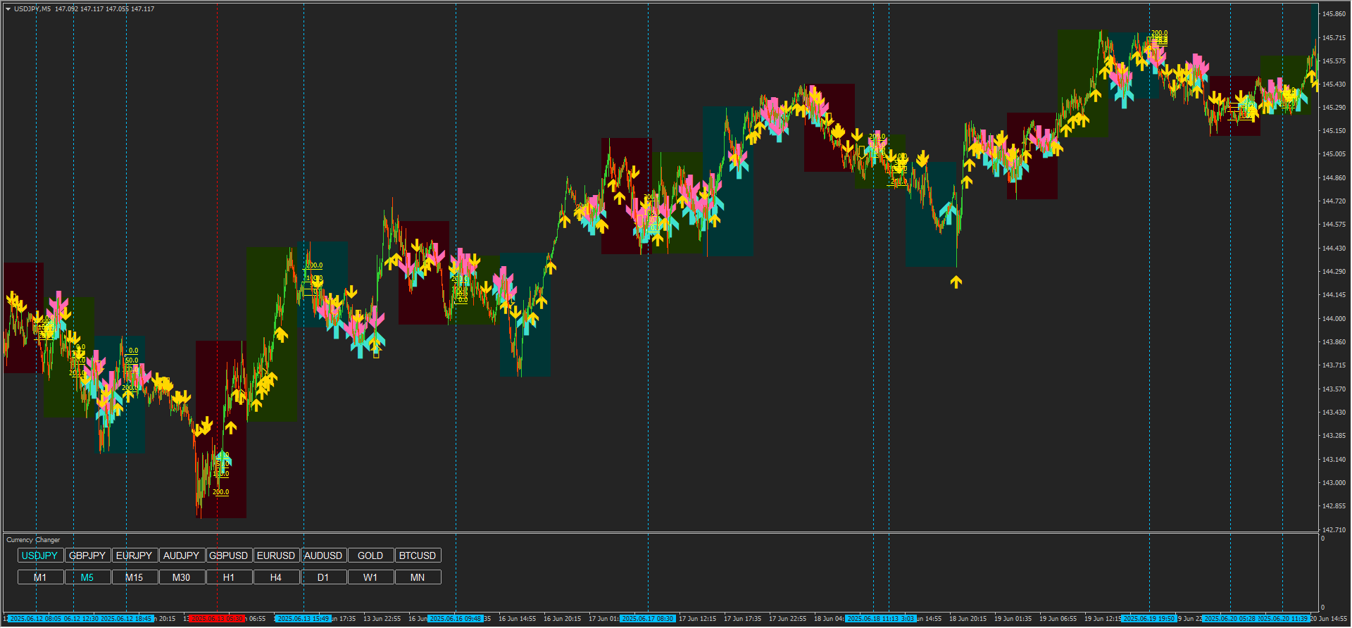 上記の画像は、1分足での結果を見やすいように、5分足に示しています。