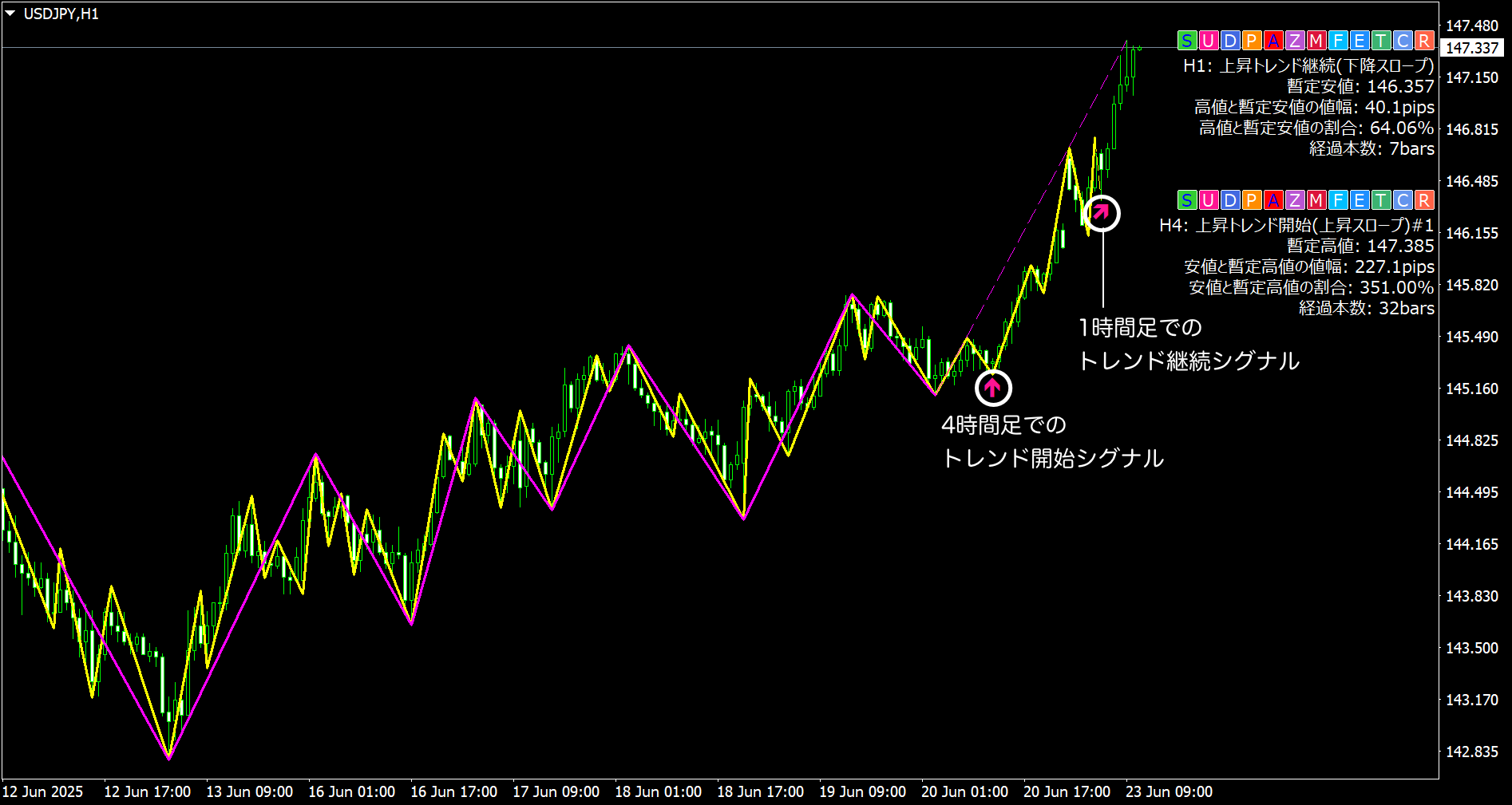 上位足でトレンド開始または継続が示されたタイミングに、下位足でも同様の状態(特に「継続」)を示すようであれば、押し目買い・戻り売りの根拠が強化されます。