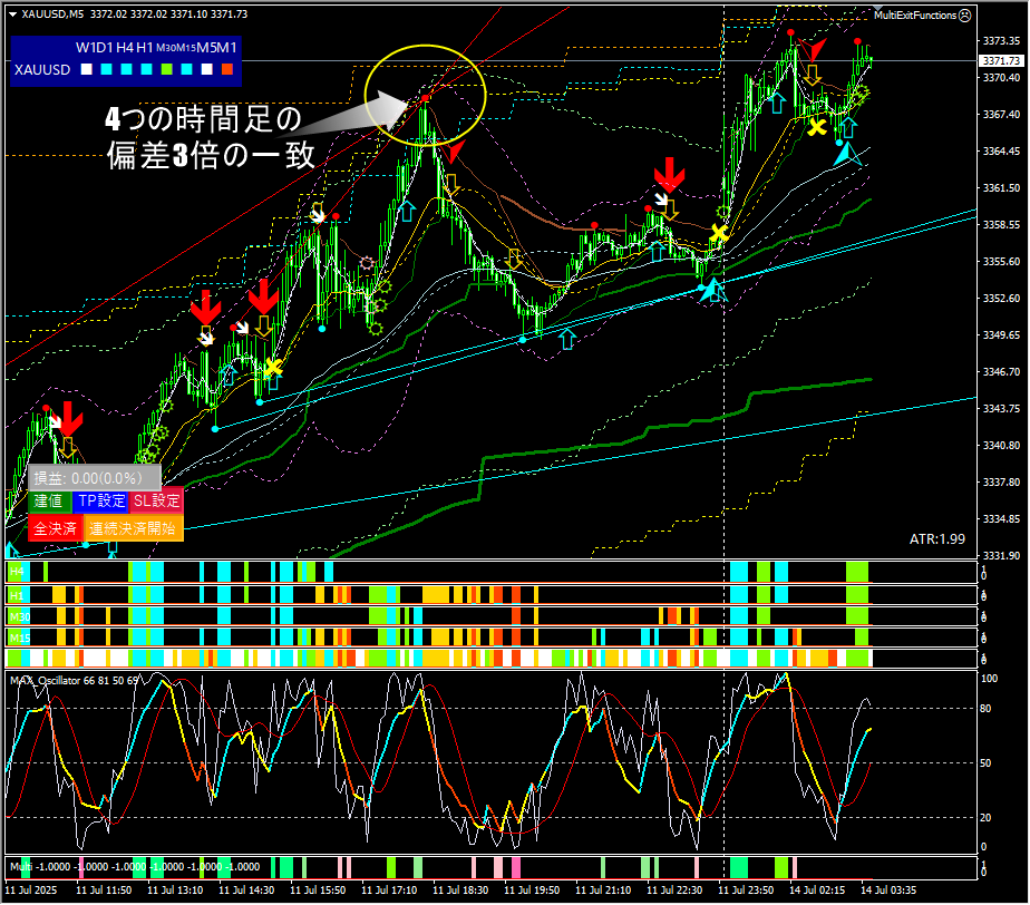 上位足4つを含めた、5つの時間足の偏差3倍の線を一括表示します。