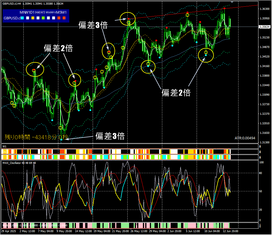 ※偏差3倍だと、EMA20から足20本分の平均値幅の3倍離れている事を示す