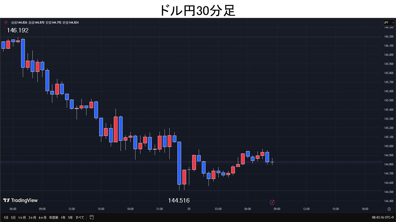 東京時間、トランプ米大統領が「イスラエルとイランの間で完全かつ全面的な停戦が合意された」と発言すると、前日まで進んでいた「有事のドル買い」の解消が先行。ドル円は、一時145.05円まで下落。なお、イスラエル・イラン紛争についてはイラン側が停戦を一時否定するなど情報が錯綜する場面もあったが、その後双方が停戦案に同意したと伝わった。欧州時間、ネタニヤフ・イスラエル首相が「イランとの停戦に同意した」との発言が伝わると、ドル円は145.00円まで下落。停戦合意後、「イランからイスラエルに向けて発射されたミサイルを確認」というイスラエル軍の発表を受け、ドル円は145.41円まで買い戻されたが、その後ドル円は145.00円を挟む小動き。NY時間、「有事のドル買い」の解消が進む中、6月米消費者信頼感指数が予想下振れ。パウエルFRB議長が米下院金融サービス委員会で「インフレが低下し労働市場が軟化した場合、利下げ前倒しの可能性もある」「インフレ率は予想ほど強くない可能性がある」などと発言すると、米10年債利回りの低下とともに全般ドル売りが先行し、ドル円は一時144.51円まで下落。