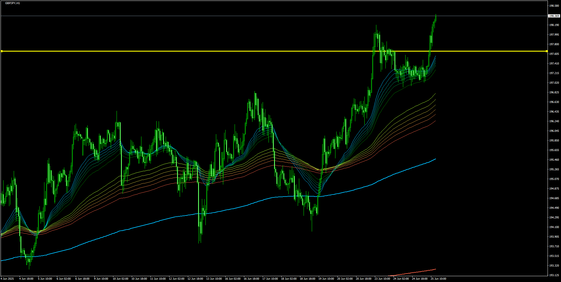 68.8pipsの利益!:GMMAトレード手法を使ったポンド円(GBP/JPY)の1時間足買いトレード