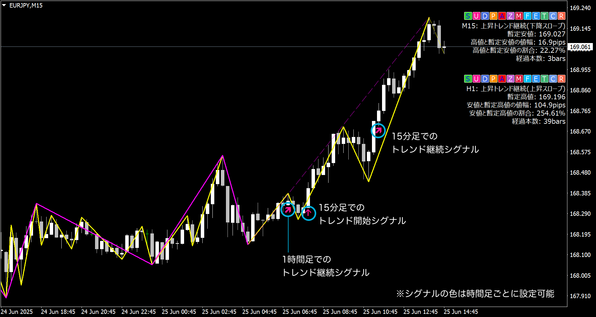 たとえば、上位足(1時間足)で「トレンド継続」の通知を受けた後、下位足(15分足)でも「トレンド開始」の通知が出た場合、押し目買い・戻り売りのチャンスとして絞り込みができます。