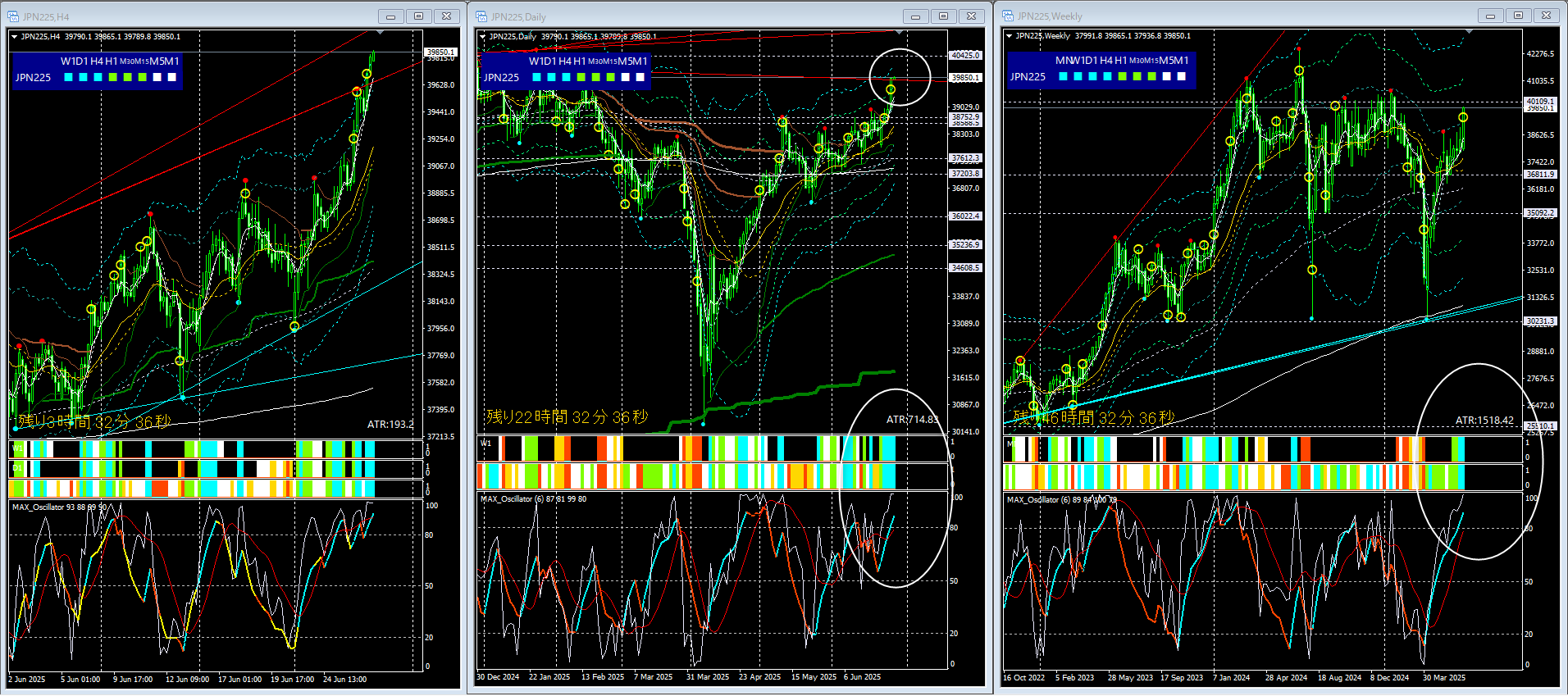週足のMAXオシレーターの位置が高い事、日足のMKチャネル偏差3倍が近い事から