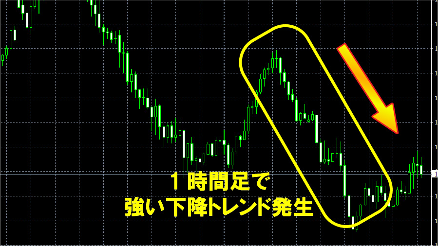 この日の相場も、1時間足レベルで強い下降トレンドが発生しており、この流れに乗るスキャルピングトレードを行うことができました