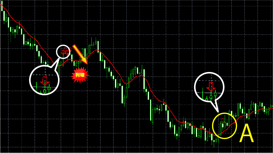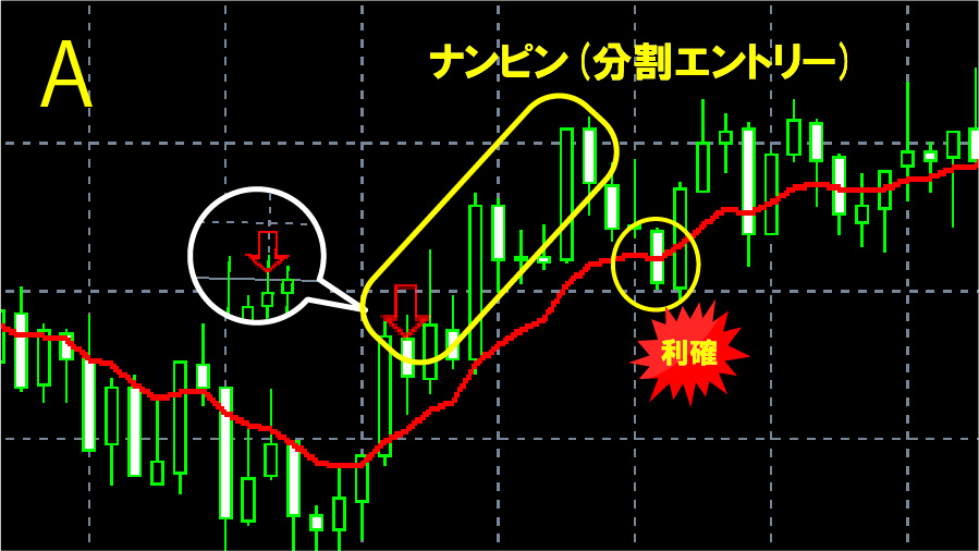 ただ、下記チャートのAのポイントだけは、エントリー後に逆行してしまい、含み損になってしまっています。