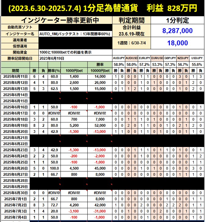 【週報:2025.6.30-2025.7.4】バイナリー1分足判定用 オリジナルツール「AUTO_1M」結果