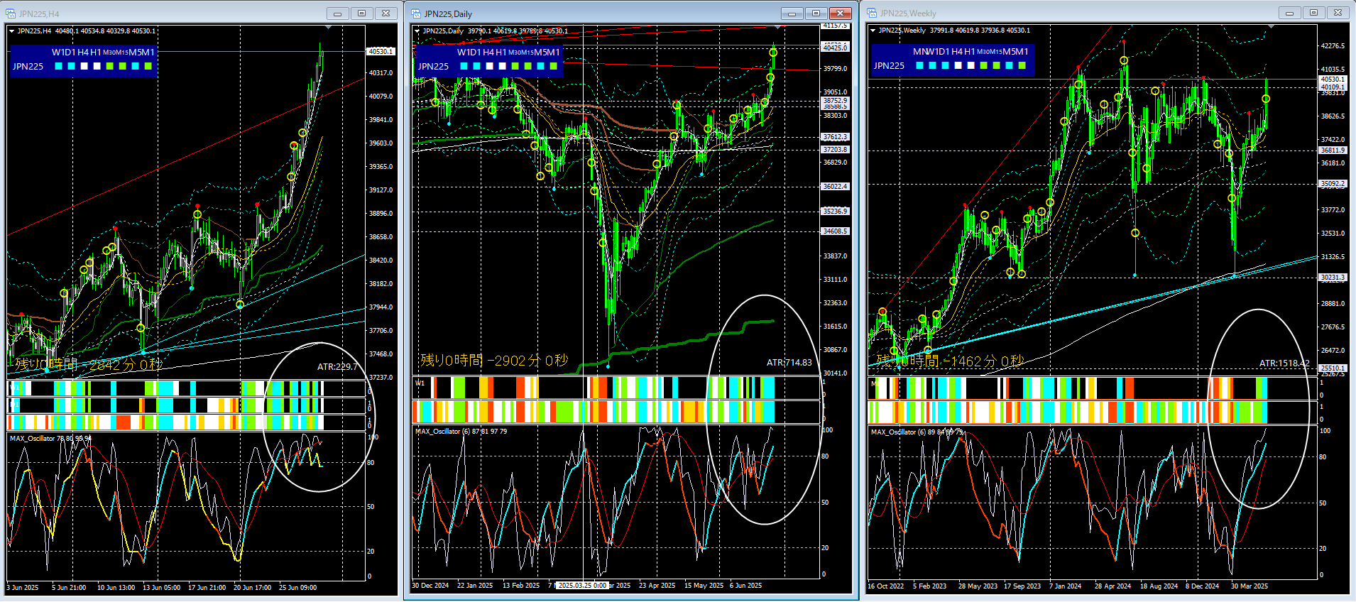 週足のMAXオシレーターの位置が高い事、日足のMKチャネル偏差3倍に到達している事