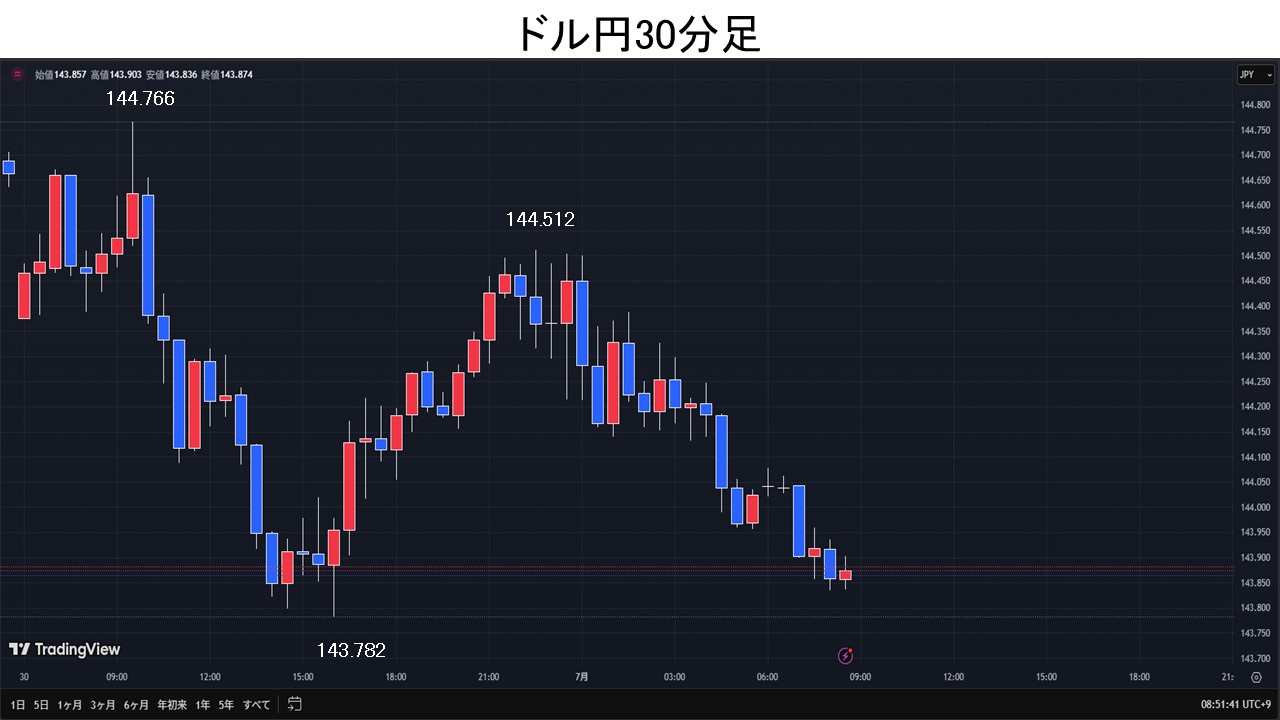 東京時間、ドル円は、週末にトランプ米大統領が日本との自動車貿易に不満を表明したことを嫌気して早朝一時144.33円まで下落。その後は東京仲値で本邦実需のドル買い観測で144.76円まで上昇となるが、一転して本邦輸出企業のドル売り観測や急伸した日経平均が上げ幅を縮小させた事などを受け、ドル円は143.80円まで下落。欧州時間、ドル円は一時143.78円まで下落となるが、その後は144.51円まで買い戻された。NY時間、6月米シカゴ購買部協会景気指数(PMI)が40.4と予想の42.7を下回り、米10年債利回りが低下すると、ドル円は143.96円まで下落。
