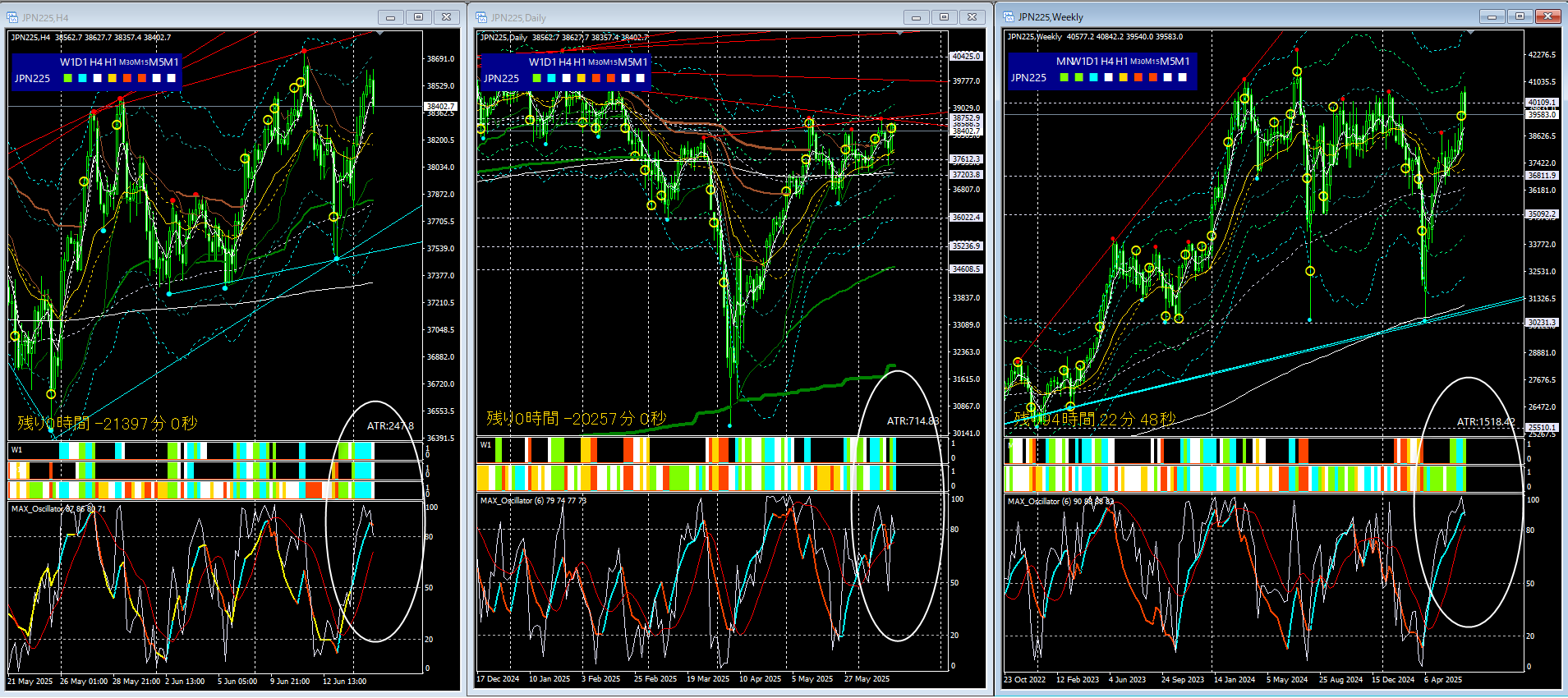 一方で、週足のMAXオシレーター、シンクロバンドは「弱い上昇」を示唆