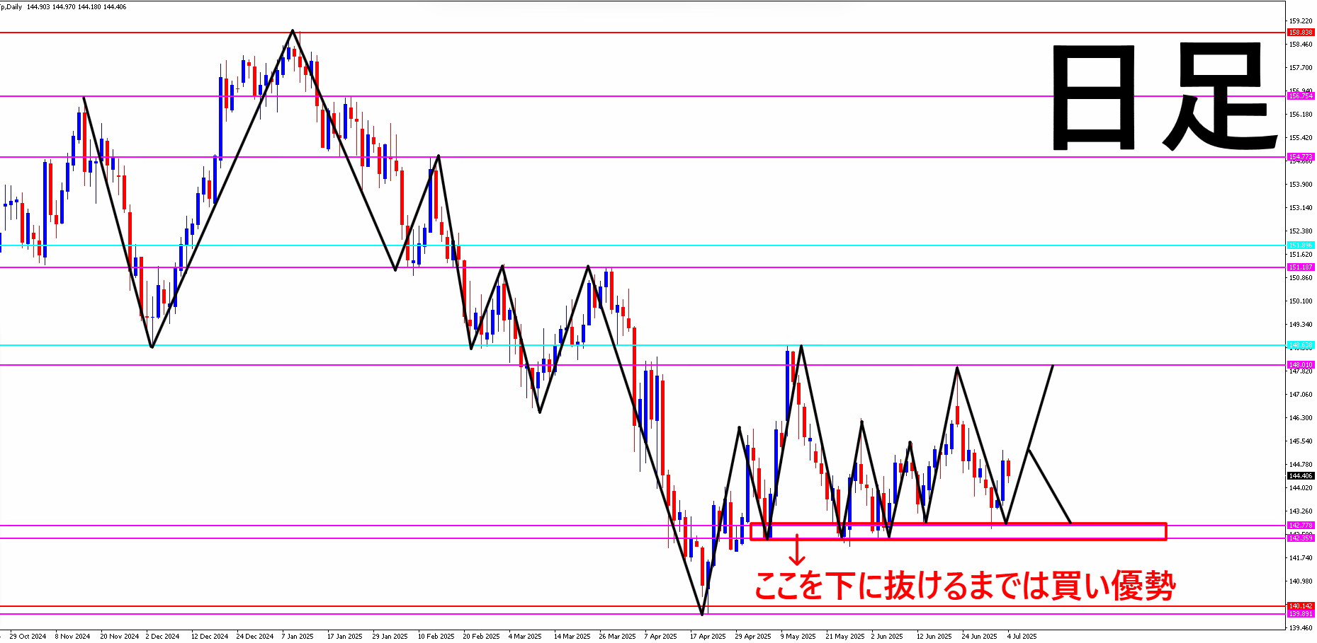 日足は買いに優位性があり、レンジ下限までを目指す下降になるのか?再び直近高値を目指した上昇になるのか?という相場状況。